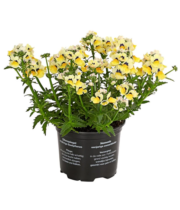 Nemesien lieben die Sonne, deshalbs sollten Sie den buschig wachsenden Beet- und Balkonpflanzen einen warmen, sonnigen oder auch halbschattigen Standort geben. Ansonsten sind Nemesien recht pflegeleicht. Sie müssen lediglich für eine ausreichende Versorgung mit Wasser sorgen. Regelmäßige Düngergaben, etwa einmal pro Woche, halten die Pflanzen in Blühlaune. Zupft man Verblühtes immer wieder aus, darf man sich bis tief in den Herbst über viele neu ‚Spiegelchen‘ freuen. Wer länger von etwas von der Pflanze haben will, sollte die Nemesien gegen Ende der ersten Blüte kräftig zurückschneiden. Auch wenn es schwer fällt die üppige Blütenpracht zu stutzen, es lohnt sich. Denn die Pflanze blüht ein weiteres mal auf, dieses mal bis in den Spätsommer hinein.