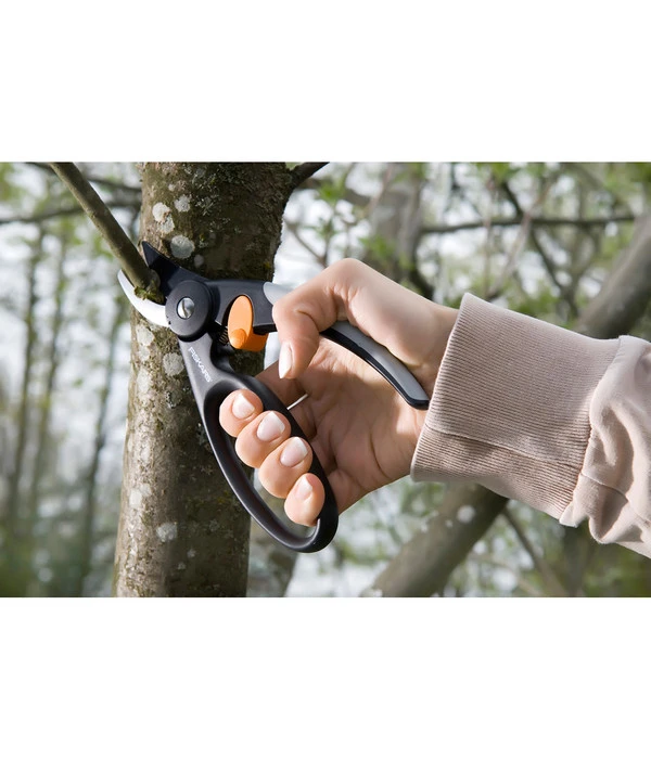 Die Klingen aus Edelstahl besitzen bei der Fiskars Bypass-Gartenschere Elegance P44 eine Antihaftbeschichtung. Das minimiert zum einen die Reibung untereinander, wodurch das Zusammendrücken wesentlich leichter geht. Zum anderen verursacht auch das Eindringen der Klingen in das Schnittgut weniger Widerstand. Weil zum Schneiden das Bypass-Prinzip angewendet wird, entsteht ein glatter und präziser Schnitt. Andere Gartenscheren, die nur mit einer Klinge arbeiten, hinterlassen dagegen häufig Quetschungen und damit Beschädigungen an den Pflanzen. Vor allem für frische Zweige eignet sie sich deshalb, weniger für totes Astwerk. Die rutschfeste Oberfläche der Fiskars Bypass-Gartenschere Elegance P44 sorgt für einen sicheren Halt beim Arbeiten. Durch den symmetrischen Aufbau ist es zudem egal, ob Sie Links- oder Rechtshänder sind.