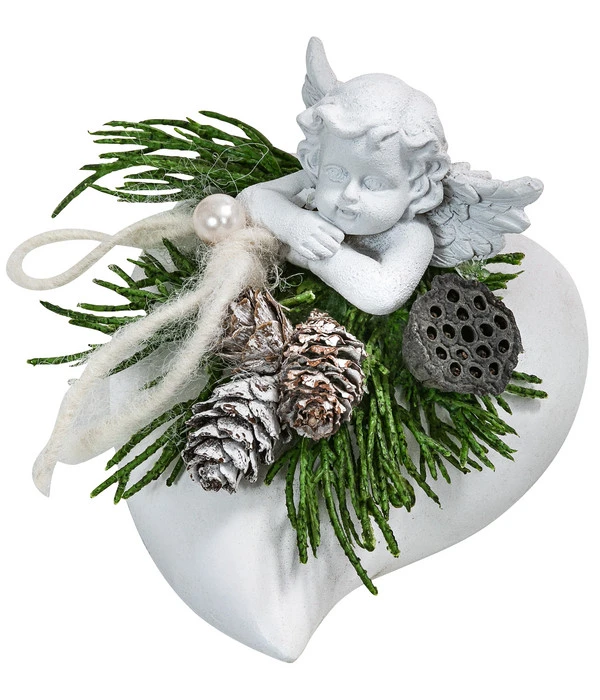 Bringen Sie mit einer geschmackvollen Grabgestaltung Ihre Verbundenheit und Wertschätzung für den Verstorbenen zum Ausdruck. Das liebevoll gearbeitete Grabherz ist mit seinen geeisten Zapfen, den immergrünen Tannen- und Koniferenzweigen sowie der edlen Kordel aus flauschiger Wolle nicht nur ein Zeichen für den bevorstehenden Winter, sondern auch ein Symbol der Hoffnung und des Lichts in einer dunklen Jahreszeit. Der handgefertigte Grabschmuck präsentiert sich in Form eines Herzens aus Keramik, mit einem verträumten Engel aus witterungsbeständigem Polyresin und einer kostbaren Perle in der Mitte des Arrangements. Dank kompakter Maße passt das Gesteck auch wunderbar für kleine Gräber.