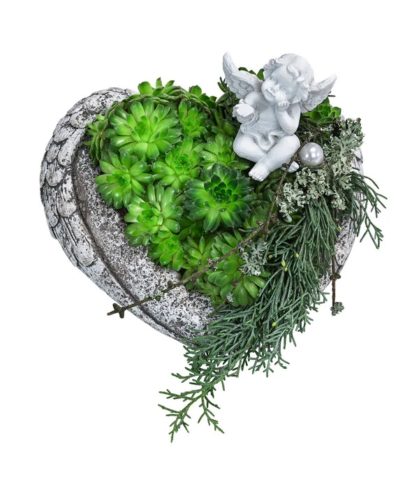 Bald ist es wieder soweit: Die Gedenktage Allerheiligen, Allerseelen und Totensonntag liegen vor uns und wie jedes Jahr werden wir die letzte Ruhestätte unserer geliebten Verstorbenen mit besonderer Sorgfalt schmücken. Denn gerade Herbst und Winter sind die Jahreszeit, in denen wir gerne für einige Momente innehalten und unsere Gedanken in die Vergangenheit wandern lassen. Und uns dabei an viele alltägliche Begebenheiten mit den lieben Verstorbenen erinnern. Wenn Sie ihnen in diesem Jahr sagen möchten, dass sie in Ihrem Herzen ewig leben und Sie sie nie vergessen werden, ist das herzförmige Grabgesteck Stille genau das Richtige. Denn diese Kreation haben unsere Floristen nicht nur mit viel Liebe zum Detail kreiert, sondern auch eine kleine Engelsfigur aus Kunstharz integriert, die Trost und Zuversicht vermittelt. Zeigen Sie Ihre Gefühle für die Verstorbenen und schmücken Sie die letzte Ruhestätte mit dem Grabgesteck Stille
