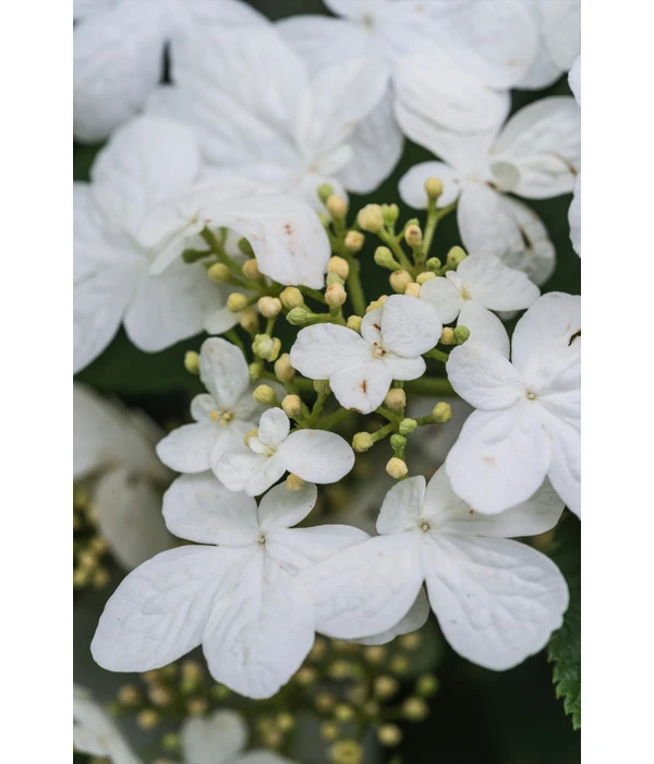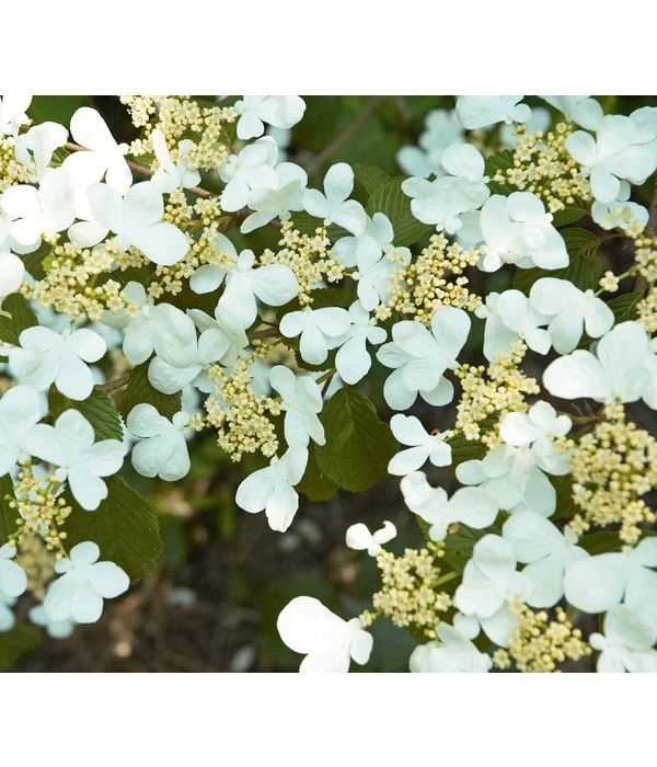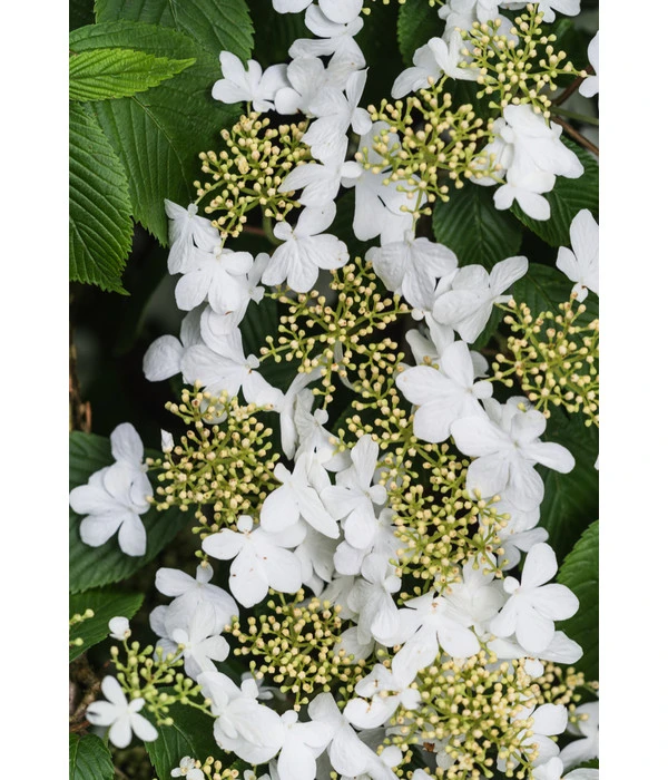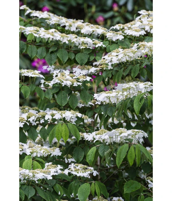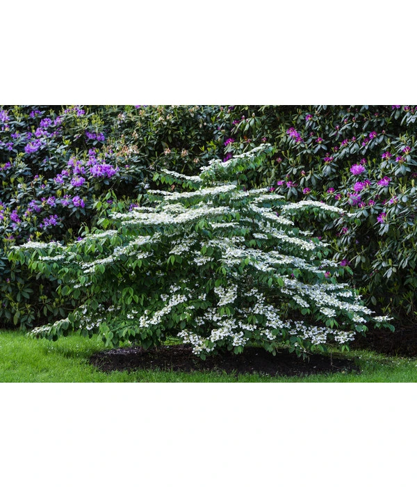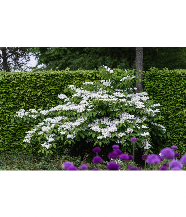 Mit seinem breit ausladenden, etagenförmigen Wuchs ist ein Japanischer Etagen-Schneeball ‘Mariesii‘ schon ohne Blüten eine eindrucksvolle Erscheinung. Wenn sich das Laubgehölz Ihnen aber im Mai und Juni im Schmuck seiner weißen, flachen Schirmrispen präsentiert, die sich im Verblühen überdies noch charmant rosa färben, wird Ihre Begeisterung kein Ende nehmen. Und Sie werden sich jedes Jahr aufs Neue sagen: “Gut, dass ich mich für den Japanischen Etagen-Schneeball ‘Mariesii‘ entschieden habe!“. Denn auch nach der Blüte sind dem Zierstrauch mit seinen fast waagerechten Trieben die bewundernden Blicke aller sicher. Doch das Ziergehölz hat noch eine Überraschung für Sie: Statt sich im Herbst mit einem stillen Laubabwurf sang- und klanglos in die Winterruhe zu verabschieden, rafft sich der Zierstrauch noch einmal zu Höchstleistungen auf und setzt sich mit einer dunkelroten bis violetten Laubfärbung dekorativ in Szene. Dann aber geht auch ein Japanischer Etagen-Schneeball ‘Mariesii‘ schlafen und erwacht erst wieder im Frühjahr.