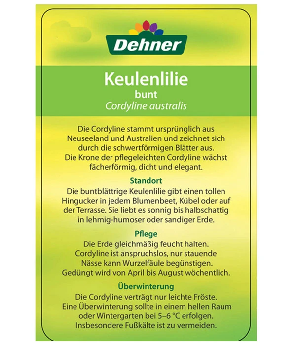 Keulenlilien sind relativ anspruchslos bezüglich der Pflege. Die bunte Keulenlilie sollte einen hellen bis halbschattigen Standort erhalten, da bei einem zu dunklem Standort die Blätter vergrünen können. Ein Platz an der Sonne ist ebenso geeignet, dort erhöht sich aber der Wasserbedarf der Keulenlilie. Generell sollten Sie das Substrat der Pflanze stets leicht feucht halten, sodass es nicht völlig austrocknet und auch Staunässe vermieden wird. Achten Sie deshalb auf eine regelmäßige und durchdringende Bewässerung. Gießen Sie erneut, sobald die oberste Erdschickt angetrocknet ist. In der Wachstumszeit, etwa von April bis August, bevorzugt die Keulenlilie eine Düngerzugabe im zweiwöchentlichen Rhythmus. Ideal um Mangelerscheinungen vorzubeugen und das gesunde Wachstum der Keulenlilie zu fördern, eignet sich der Dehner Palmen-Dünger. Während der Wintermonate sollten Sie die Keulenlilie zurück ins Haus holen und kühl und hell überwintern.