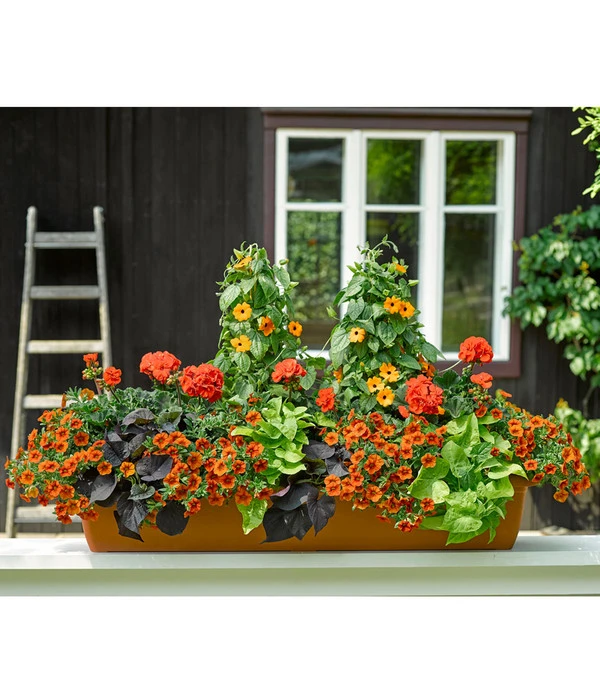 Das kleinblütige Petuniensortiment steht den großblütigen Pflanzen in nichts nach. Neue, bisher unbekannte Farben bereichern Kästen sowie Kübelgefäße. Auch unsere orangefarbene Sorte ist mit Feuereifer dabei, Knospe für Knospe im Rhythmus der Sonnenstrahlen zu öffnen. Nicht selten bilden die regenfesten Pflanzen so dichte Blütenkugeln, dass man bald schon kein Laub mehr sieht. Diese exklusive Neuheit der hängenden Zauberglöckchen weist mittelgroße Blüten auf, die mit ihrem knalligen Orange wirklich jeden verzaubern. In Kombination mit anderen kleinblumigen Balkonpflanzen bildet diese Pflanze vom Frühjahr bis zum Herbst wahre Blütenbälle. Überzeugen Sie sich selbst von diesem robusten, ausdauernden und besonders dekorativen Sommerblüher.