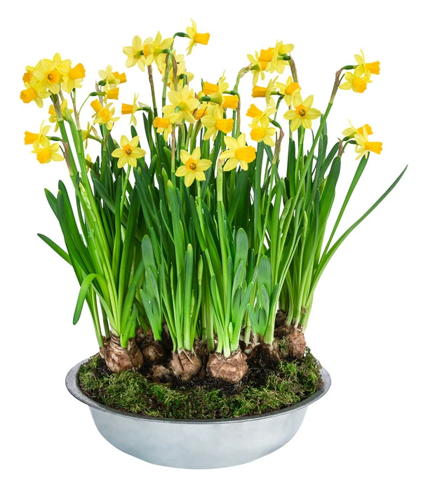 Der Frühling steht vor der Tür, aber Sie haben einfach keine Idee für pflegeleichte Frühlingsdeko? Kein Problem, denn diese Zinkschale kommt schon fertig bepflanzt und dekoriert zu Ihnen. Das wunderschöne Arrangement beherbergt nicht nur ‚Tête à Tête‘-Narzissen, sondern wurde auch mit Moos und Rindenstücken abgedeckt für eine besonders naturnahe Optik. Ob im Eingangsbereich, auf einem Tisch draußen oder neben einer schönen Gartenbank: lassen Sie die Zinkschale mit Narzissen wirken. Denn sobald die Blumen ihre gelben Blüten zeigen, geht bei Ihnen Zuhause die Sonne auf und der Frühling hält endgültig Einzug. Das liebevoll gestaltete Ensemble zeigt dabei nicht nur die robuste Schönheit der Natur, sondern auch, wie sehr Blumen unsere Stimmung aufhellen können. Überzeugen Sie sich selbst!
