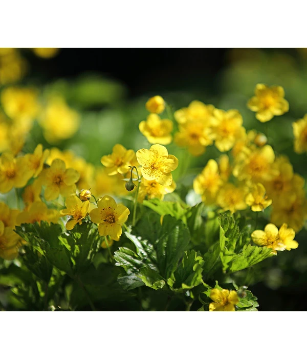 Ursprünglich in den Wäldern Europas und Vorderasiens beheimatet, ist die Waldsteinie ein entfernter Verwandter der klassischen Erdbeere. Besonders die Blätter der auch Golderdbeere genannten Pflanze lassen die Verwandtschaft erahnen. Der relativ starkwüchsige Bodendecker bildet immergrüne Teppiche, die im April bis Juni mit zahlreichen gelben Blüten überzogen werden.