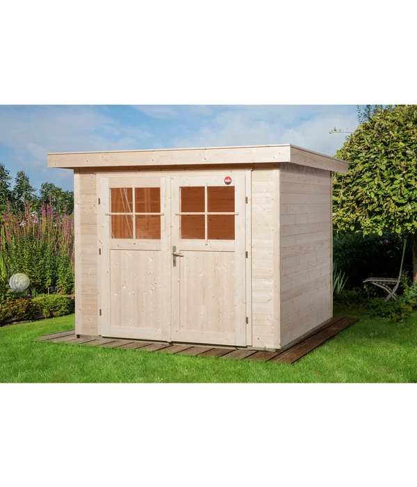 Der Rasenmäher wartet blitzsauber und einsatzbereit in der Ecke, ebenso wie der Grill, dahinter hängen Ihre Harken, Sägen und Scheren sauber an der Geräteleiste. Links haben Sie einen stabilen Tisch hineingestellt, an dem Sie Pflanz- und kleine Reparaturarbeiten erledigen können, auf den Regalbrettern lagern Pflanztöpfe, verschiedene Dünger, Erden und was Sie sonst noch als Gärtner brauchen. Ja, so ordentlich und geschützt können Sie in Zukunft Ihre Geräte und Werkzeuge unterbringen. Und so attraktiv! Denn das Weka Gartenhaus 227 ist auch ein kleines Schmuckstück, das jede Gartenanlage bereichert. Das liegt zum einen sicherlich an dem Naturmaterial Holz, das sich mit seiner natürlichen Ausstrahlung harmonisch in die Gartenanlage einfügt, das liegt aber auch an der gelungenen Optik, die moderne Stilelemente wie das Flachdach mit einladenden Details wie den Sprossenfenstern in der Tür verbindet. Bringen Sie Ordnung in Ihren Garten – mit dem Weka Gartenhaus 227! Und im Winter finden dort auch Ihre Gartenmöbel ein trockenes Plätzchen.