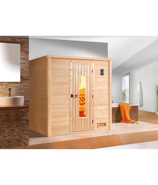 Sie sind durch und durch Sauna-Fan. Aber eigentlich wären Sie beim Entspannen lieber mit Ihrem Partner/Ihrer Partnerin unter sich und würden danach auch am liebsten auf Ihrer eigenen Liege ruhen? Dann sollten Sie einen genauen Blick auf die Weka Sauna Bergen mit Holztür werfen. Denn diese attraktive Heimsauna ist ein Traum. Vielleicht haben Sie in Ihrem Bad eine Ecke frei oder einen ungenutzten Raum in petto? Oder vielleicht planen Sie ja sogar im Untergeschoss einen privaten Wellnessbereich einzurichten? Diese einladend rustikal wirkende Saunakabine braucht erstaunlich wenig Fläche und bietet im Inneren trotzdem ausreichend Platz für zwei Personen, um sich auf zwei Ebenen dem Genuss der Wärme und des Schwitzens hinzugeben – im Sitzen oder liegend, den Kopf auf den Kopfstützen. Dabei vermittelt Ihnen die attraktive Massivholztür ein Gefühl des Rückzugs und der Gemütlichkeit. Beschenken Sie sich doch einfach mit einer Weka Sauna Bergen mit Holztür!