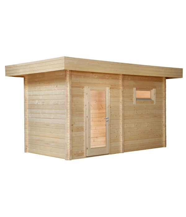 Bei der Wahl Ihrer Traum-Gartensauna spielen neben der grundsätzlichen Entscheidung für diese wohltuende, gesunde Freizeitbeschäftigung verschiedene Aspekte eine Rolle. Wer sich, wie Sie mit dem Finnhaus Saunahaus Mikko 70 Vollglastür für einen Bausatz in Premiumqualität interessiert, möchte gerne selbst Hand anlegen und den Traum von der eigenen Sauna Blockbohle für Blockbohle wachsen sehen. Unbenommen, dass Sie das Ergebnis so noch mehr genießen und jeden Winkel bereits kennen werden, wenn Sie zum ersten Mal wohlig schwitzend auf der Ruhebank sitzen. Aber Sie werden diese Gartensauna auch deshalb wählen, weil das kubische Design mit dem massiv wirkenden Pultdach genau Ihrem Stil entspricht und Sie die nordische Ausstrahlung des naturbelassenen Holzes lieben. Die Vollglastür und das schmale Fensterband unterstreichen die geradlinige Gesamterscheinung des Gebäudes. Gönnen Sie sich einen besonderen Blickfang im Garten – mit dem Finnhaus Saunahaus Mikko 70!